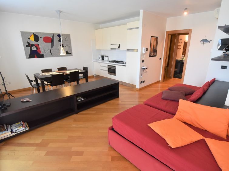 "Judeca Nova", appartement 2-kamers 60 m2, op verhoogde begane grond. Ruim en licht, comfortabel en modern ingericht: woon-/slaapkamer met panoramavenster op het oosten met 1 divanbed en TV. 1 kamer met 1 2-pers bed. Kookhoek (4-pits kookplaat, oven). Douche/bidet/WC. Verwarming, air-conditioning. Parketvloeren. Panoramazicht op zee, het kanaal en Lagune. Ter beschikking: strijkijzer, haardroger. Internet (Internet (WiFi), gratis). Let op: niet rokers woning. M0270427284